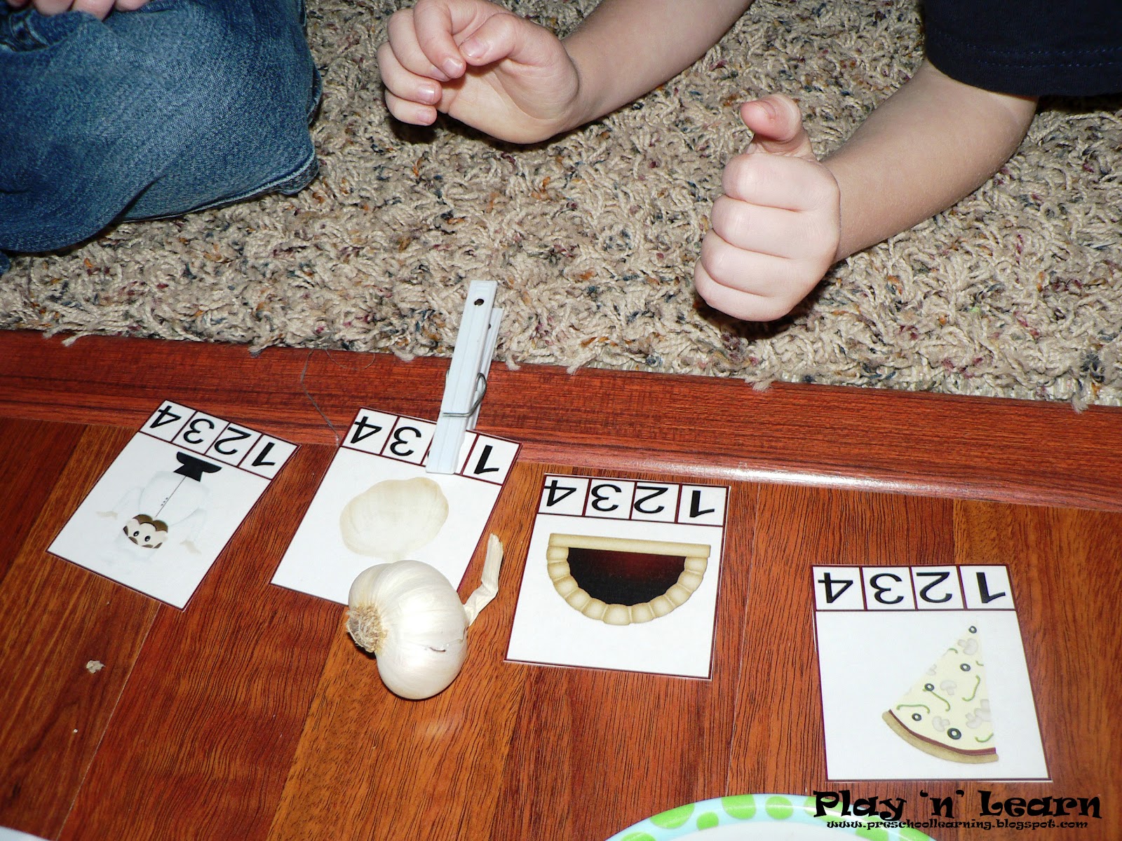 These pictures really sparked interest. One point of interest was the garlic picture. They really didn't know what it was, one child did guess onion though! So I pulled out an onion and a garlic and we talked about them. They were pretty excited when I opened up the garlic and let them pull apart the individual cloves. Got a little math in there too. How many cloves in this bulb, how many in that one? Which has more?